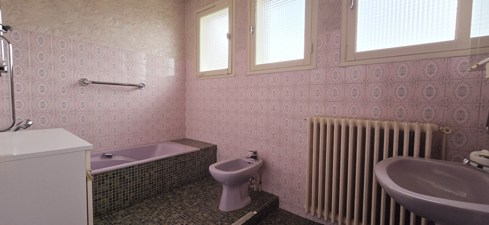 Grande entrée avec son sol granito d'origine, une buanderie et un garage d'environ 40m².